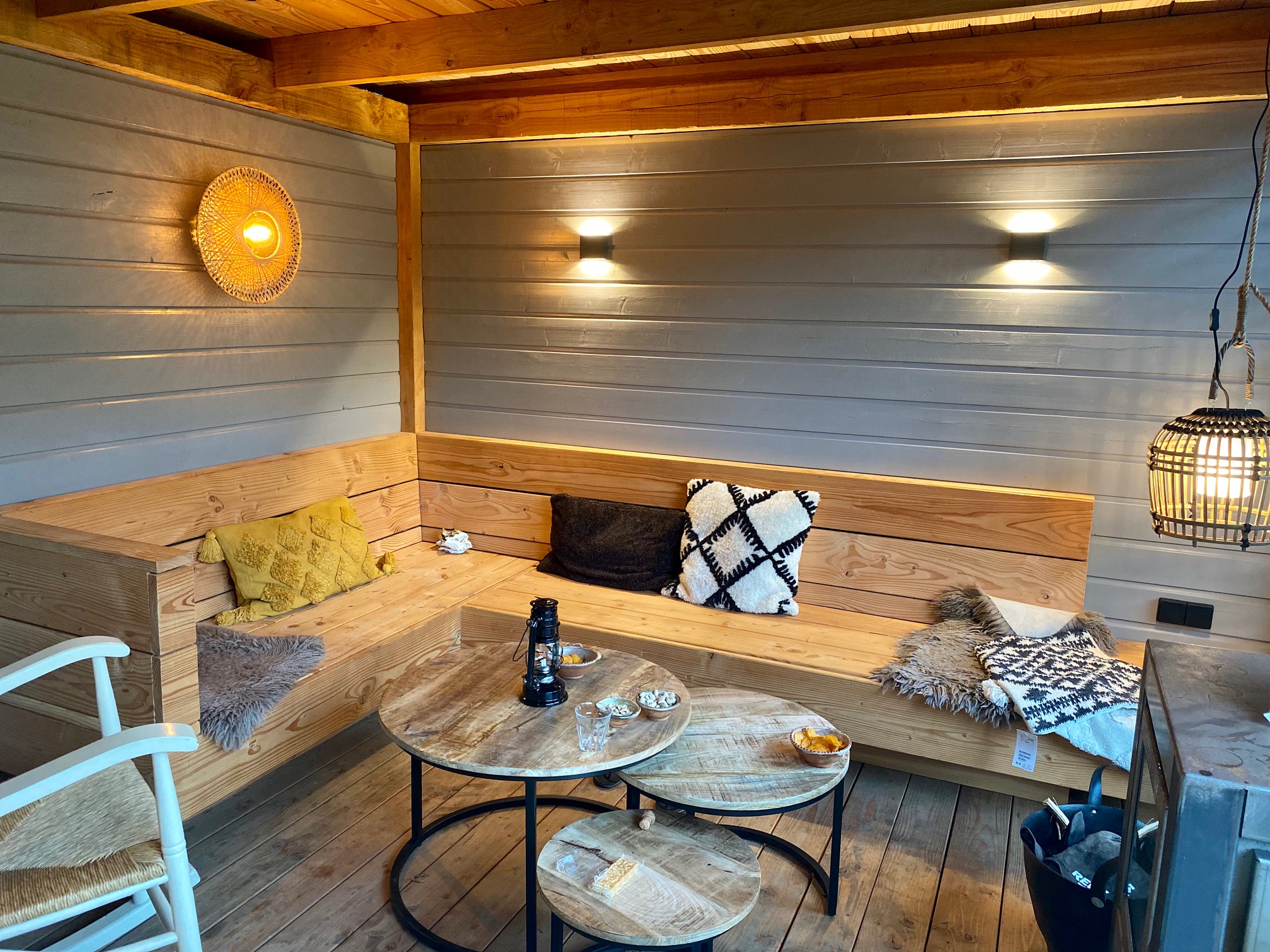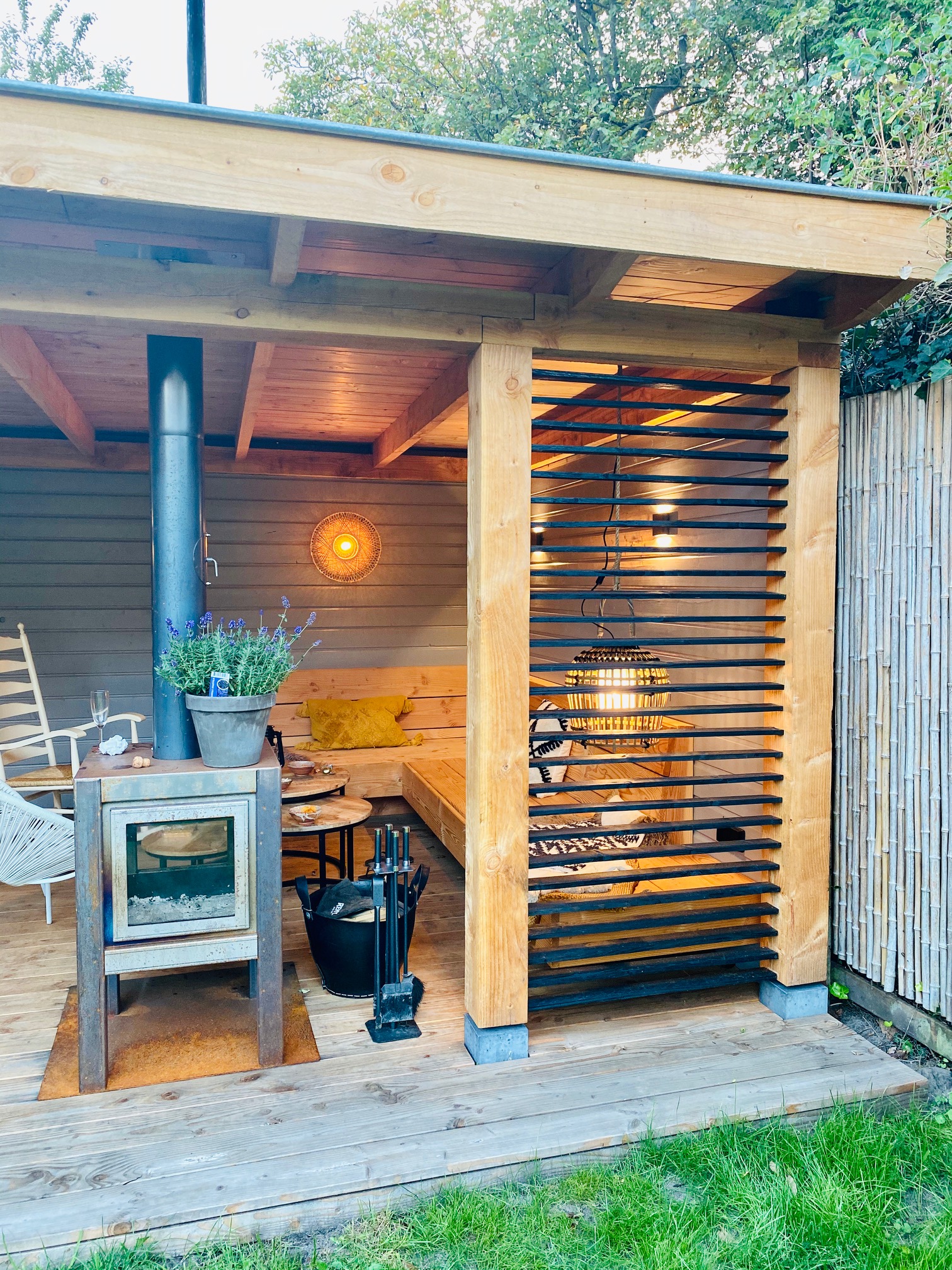 Bij deze Goosiche hut hebben we de traditionele Douglas overkapping gecombineerd met moderne lamellen.