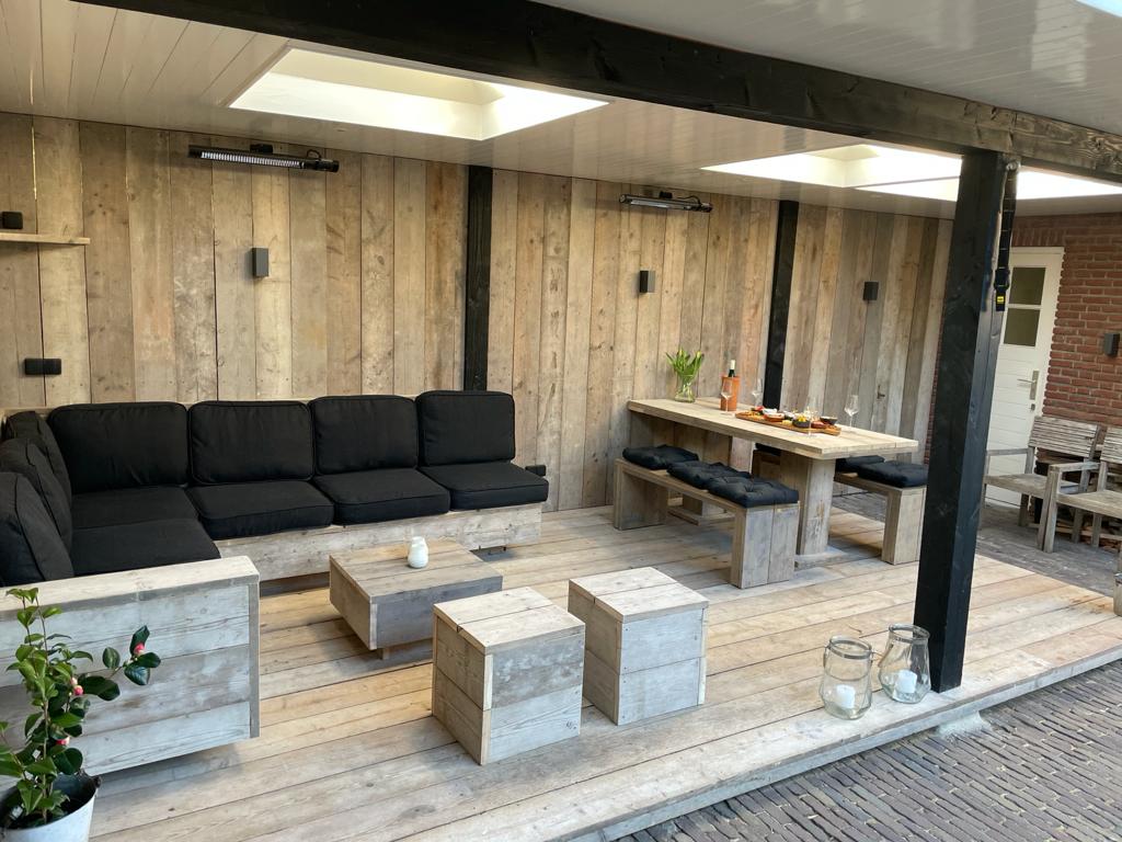 De banken, tafel en hockers zijn op maat gemaakt van gebruikt steigerhout.