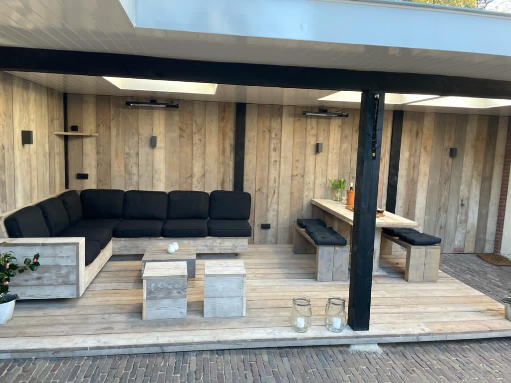 Tevens een steigerhouten vlonder en de zijwand en achterwand in steigerhout met ingebouwde stopcontacten en heaters.